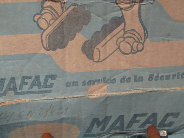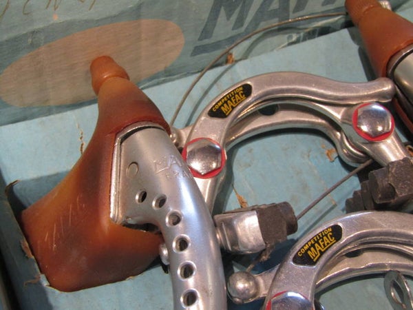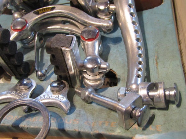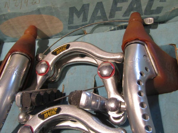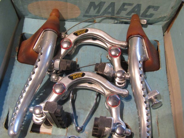 MAFAC COMPETITION BRAKE SET, CALIPERS, LEVERS, CABLE YOKES will all be new, CALIPERS will be with NO wheel guides. Hoods will be not so supple, will need to be re-hydraited. We will provide 2 different front cable hangers, 1X MAFAC FRENCH SIZE, 2nd hand / 1X CLB Keyed type NOS!