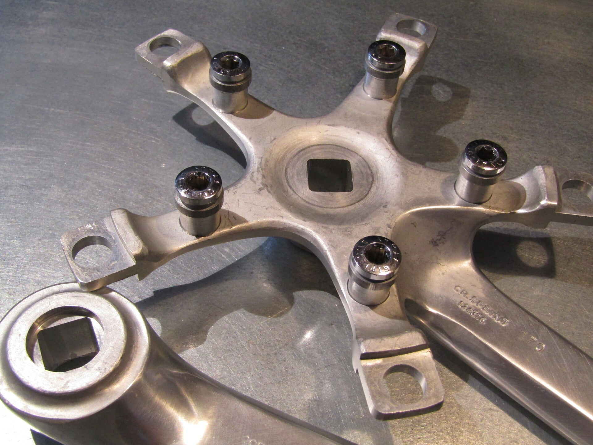 GIPIEMME SPRINT TRIPLE 170mm - 9/16 crank arm set with ORIGINAL GRANNY gear mounting hardware BCD 84 / 144mm, NOS! This item will show some shelf wear, face of the right crank arm will show some minor scuffs. These crank arms will have the LOOKS of CAMPAGNOLO VICTORY ,,,, But these cranks will be with more attention to detail and a nicer SATIN finish will be with a step-down near the chain-wheel bolt hole end result an nicer looking crank arm set.