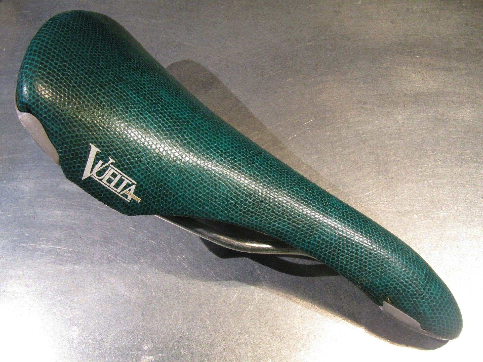 BASSANO VUALTA GREEN Saddle with Scotchlite PROTACTIVE COVER 305 grams, rear under-side GRAY COVER will be with some cracks, but will not have any effects of the use of this saddle. MADE IN ITALY