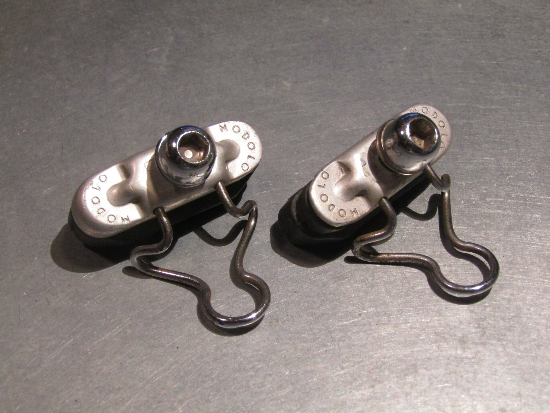MODOLO PROFESSIONAL VINTAGE 70's Brake block set 1st GENERATION with RUBBER BLOCKS NOS! SUPER RARE! This item will be from a depleted never used caliper so it will show signs of being fitted, there will be signs of shelf wear, chrome wheel guides will be with some minor surface rust.